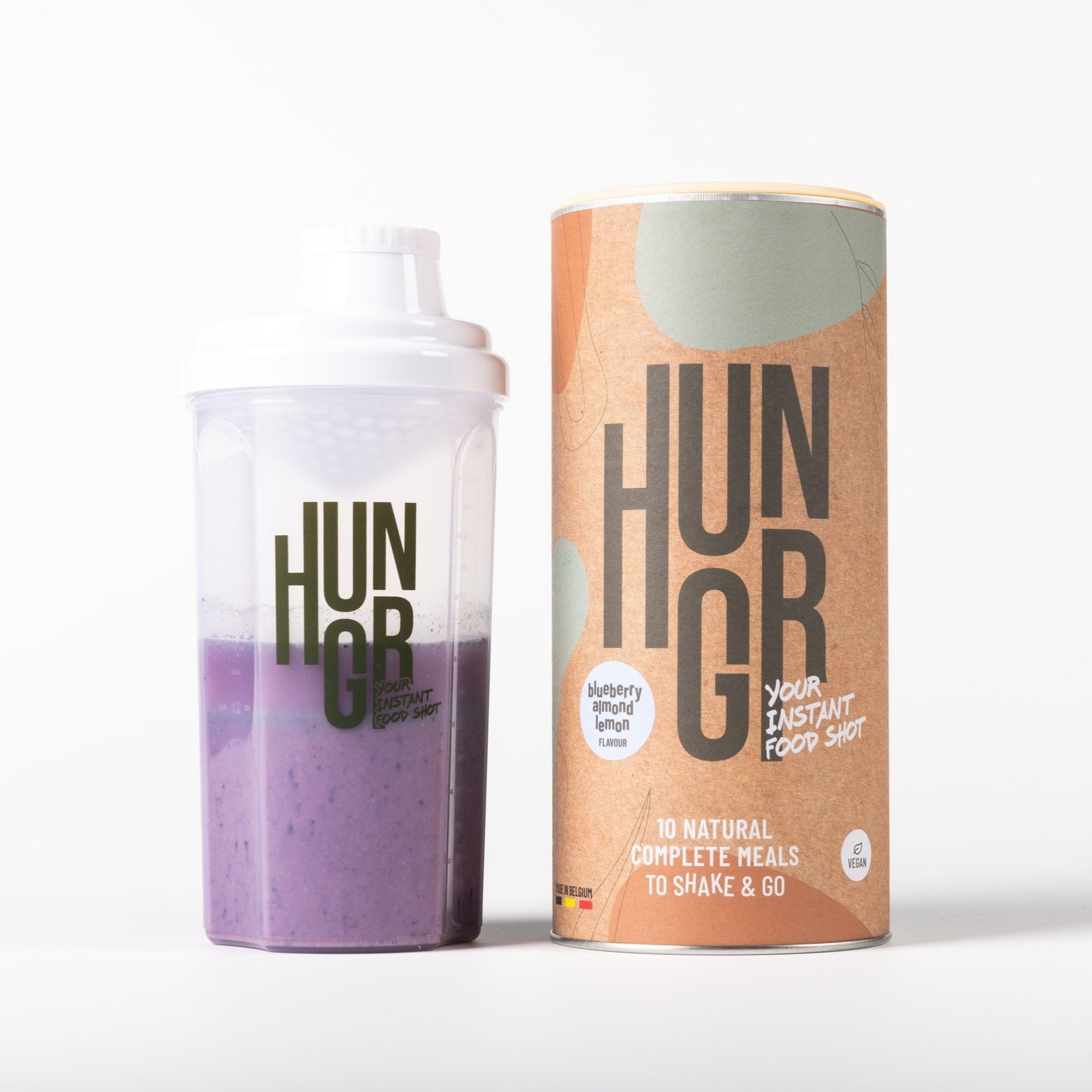 Meng 2 scoops met 300 ml (plantaardige) melk of water Meer HUNGR? Meng 3 scoops met 450 ml |