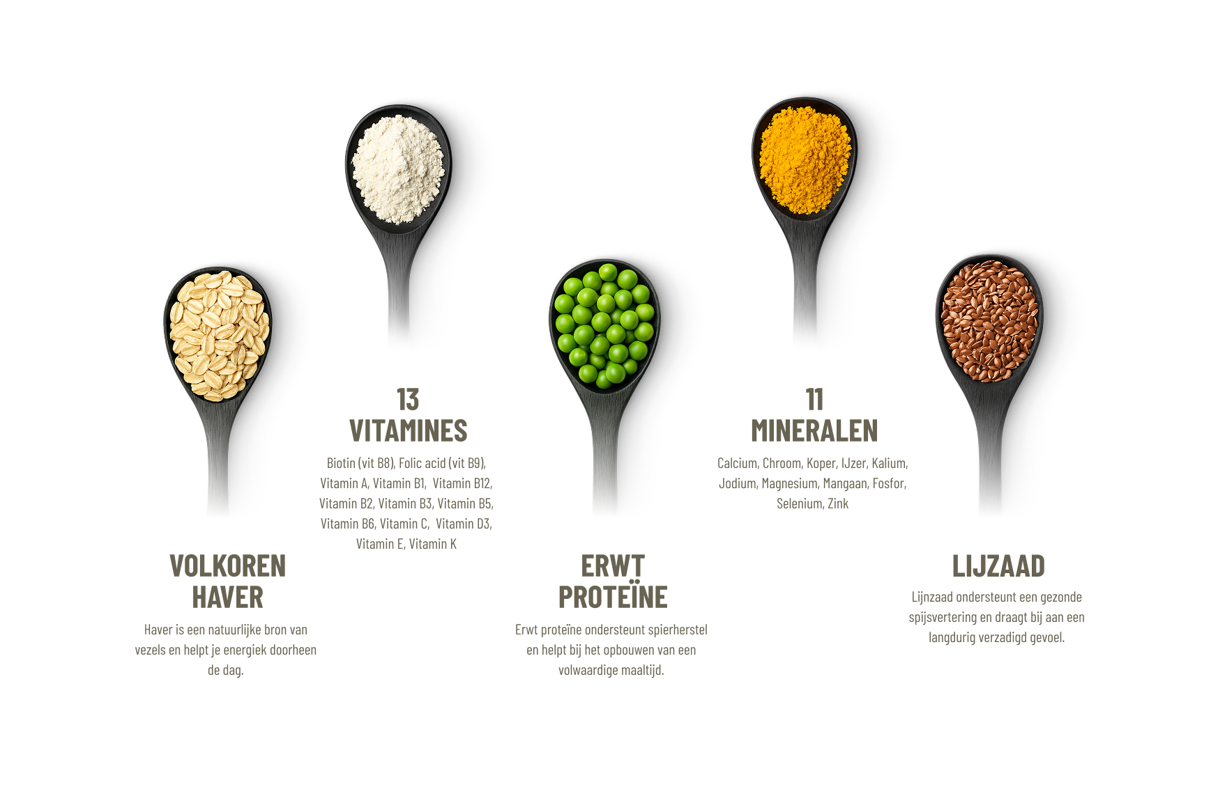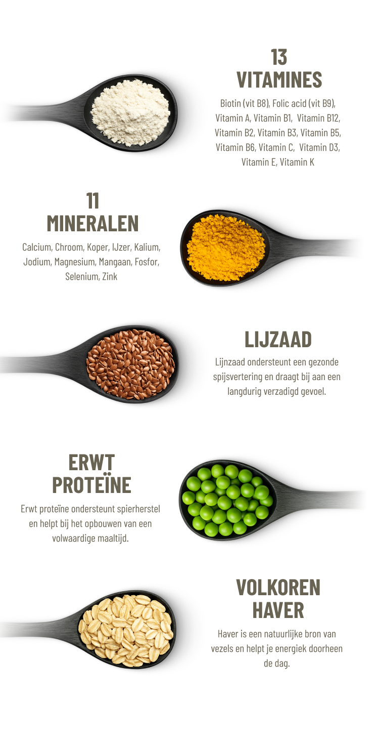 Formule op basis van volkoren haver, erwt-proteïne en lijnzaad, verrijkt met 24 vitamines en mineralen.